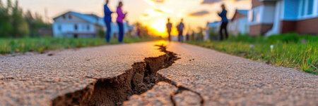 A group of people gather near a cracked pavement in a residential area during sunset, observing the damage.