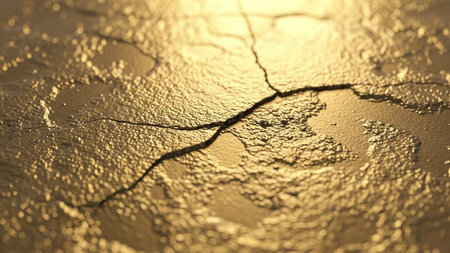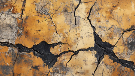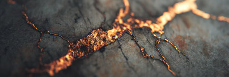 Concrete surface shows cracks with golden lines, highlighting the contrast between textures and colors in a unique way.