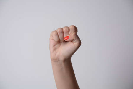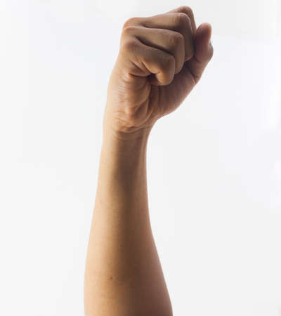 Woman raised fist, or the clenched fist, isolated on white background.