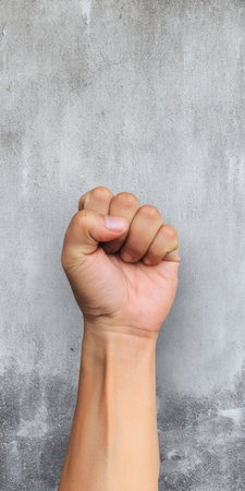 Human hand forming a clenched fist, raising it upwards in a gesture of protest, power, and determination against a distressed concrete wall background, representing resistance and resolve