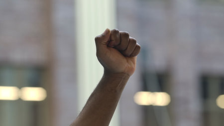 Human fist clenching, showing strength, determination, and solidarity, representing a strong stand for resistance and unity against a blurred background