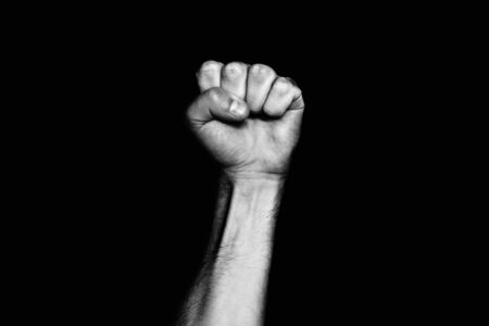 Man's fist raised up in the air on a black background.