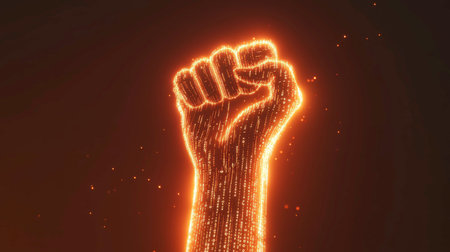 A raised fist symbolizes peace, surrounded by flowing orange lights and intricate digital binary code. This high-detail portrayal conveys a message of unity and hope in a minimalist aesthetic.