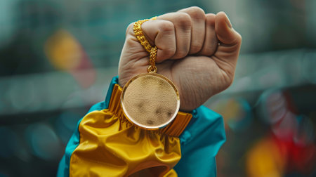 A hand holding a gold medal with a red ribbon. sports competition concept