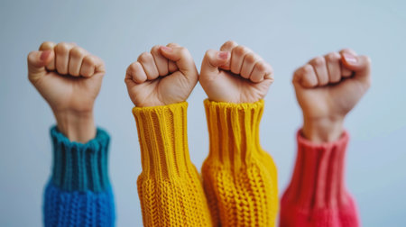 International Women's Day symbol of love and diversity - people's hands raised with clenched fists. Human rights, feminism, equality