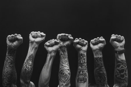 Tattooed fans raising their fists in solidarity --ar 3:2 Job ID: c09f0a5e-ad78-4f58-8f7a-fedce3b35274