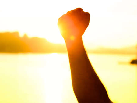 Close-up of a man's fist in the air on a blurred background.