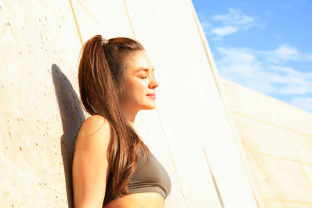 Cropped image of fitness woman in sportswear posing over grey concrete wall.