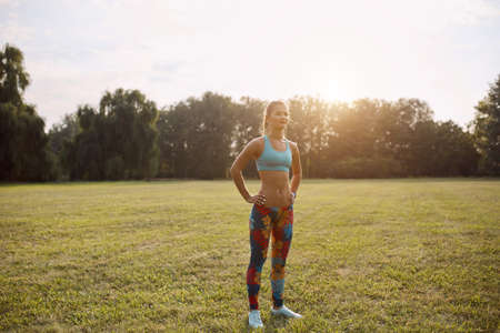 Fit young woman in activewear looking very cheerful while ready to start her workout exercises outdoors