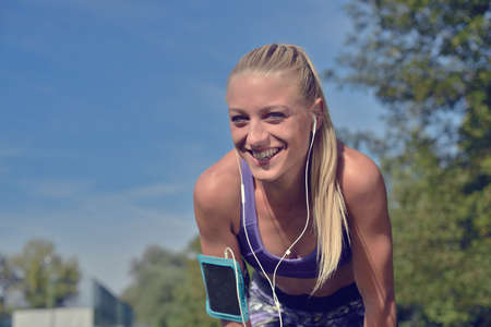Fitness woman in sportswear after workout is listening to music in headphones outdoors