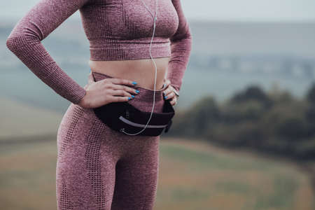Close Up Unrecognisable Young Woman Holding Hands on Waist and Listening Music Outdoors on the Hill