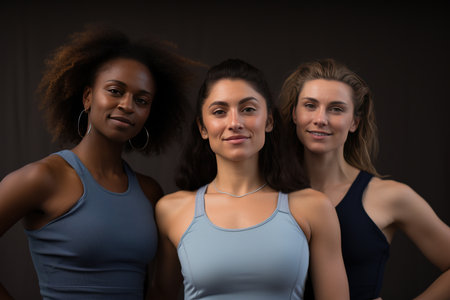Studio shot of smiling women in sportswear, celebrating wellness, body positivity, and active fitness lifestyles together.