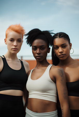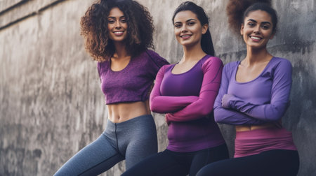 Three cheerful young women wearing colorful athletic outfits, expressing joy and togetherness, standing against a textured wall. A vibrant depiction of friendship and fitness, filled with positivity and camaraderie.