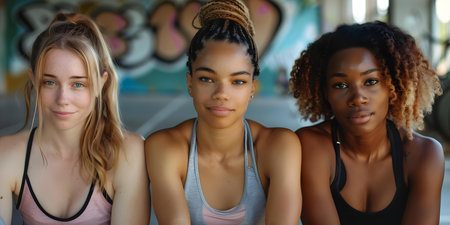 A multicultural group of women in athletic wear smiling confidently in a show of unity and strength.