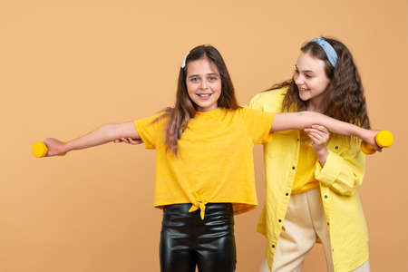 Young beautiful brunette girl showing how to use dumbbels to her little sister. Healthy active lifestyle, sport, bodycare concept