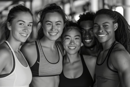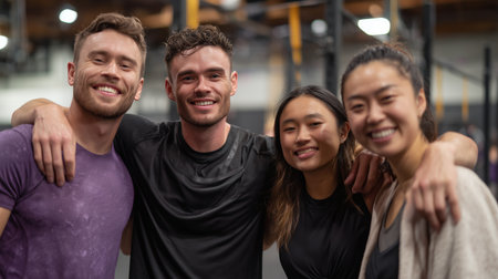 Multiethnic group of smiling individuals in athletic wear posing together in a fitness center