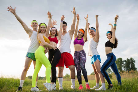 Fitness, sport, friendship and healthy lifestyle concept. Group of happy people exercising outdoor.