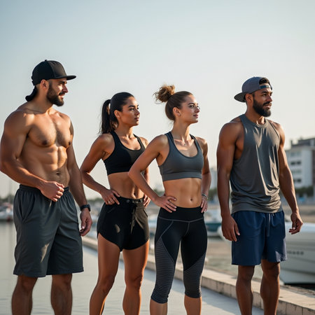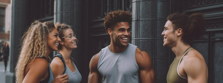 Group of smiling, multi ethnic athletes wearing vibrant sportswear, preparing for an energetic urban workout, embodying the spirit of health, fitness, and community