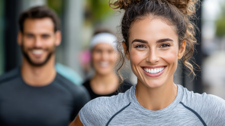 A group of diverse individuals stands confidently outdoors, ready for a fitness activity. They display a positive attitude as the city skyline looms behind them.