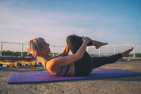 Young caucasian blond fitness woman training abdominal muscles while lies on mat on concrete floor. healthy lifestyle