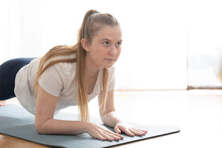 Closeup of blonde teenager making a plank. Working out at home concept