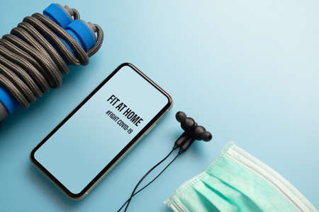 Fit At Home, Healthy at home for quarantine times in Coronavirus pandemic outbreak background concept. Mockup mobile phone for Be Active during virus pandemic. Fight Covid-19