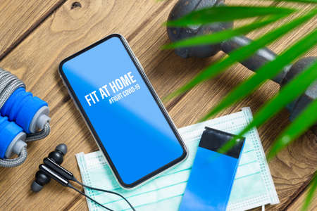 Fit At Home Workout for quarantine times in Coronavirus pandemic outbreak background concept. Mockup mobile phone for Healthy at Home, Be Active during virus pandemic. Fight Covid-19