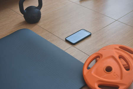Sport set up material with a mobile at the flor for online training at home