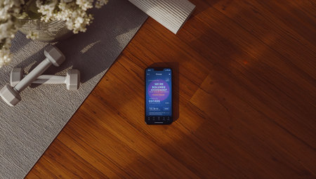 smart phone with fitness app and dumbbells on the wooden floor