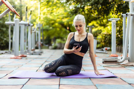 Fitness woman using smartphone while sitting on the mat on the sports ground