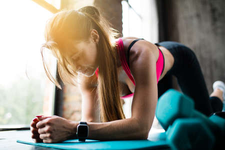 Fit person with a healthy lifestyle. Young caucasian woman doing a plank while training with an online coach