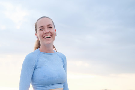 A low-angle shot of a beautiful, happy Black woman with an afro hairstyle, wearing earbuds and athletic clothing, laughing joyfully against a bright blue sky.