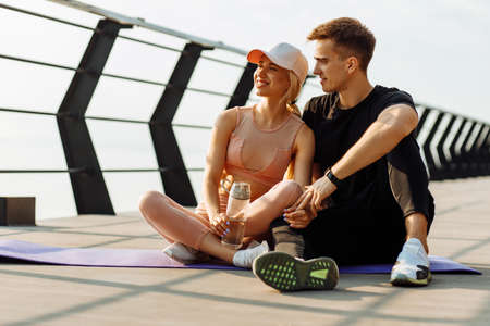 Healthy couple resting after hard workout outdoors, Couple exercising together, man and woman resting after fitness class on fitness mat on pier