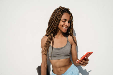 Cheerful young sport african girl standing outdoors, holding fitness mat, using mobile phone
