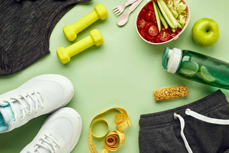 Creative flat lay of sport and fitness equipment. Women's white sneakers, water bottle, sportswear, dumbbells and lunchbox with healthy vegetable salad, on light green background.