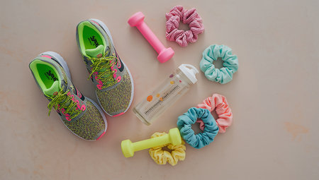 Women's sport wear, Gym fashion and accessories, Exercise Equipment, Healthy lifestyle concept, Shoes, Yoga Mat, Sport Bra.