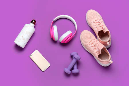 Sports water bottle, shoes, headphones and mobile phone on color background
