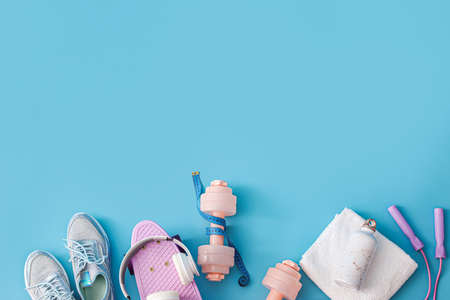 Woman fitness and sport concept background. Sneakers, jumping-rope, tape measure and dumbbells. Sport, fitness and healthy background. Spring spring return to fit. Top view flat lay copy space