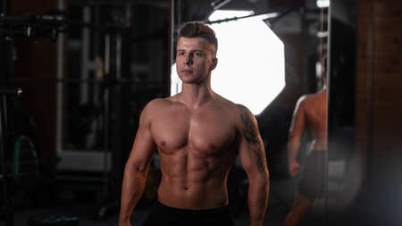 Handsome young athlete man bodybuilder with naked muscular torso trains in the gym on a dark background