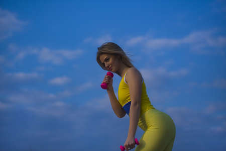 Website header of Beautiful sporty woman doing exercise with dumbbells