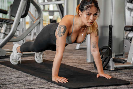 Asian sports woman in the gym, athletes training, workout lifting weight, plank and push up. tattoo thai girl