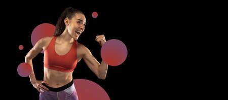 Sprinter run. Strong athletic woman and man running on black background wearing in the sportswear. Fitness and sport motivation. Runner concept.