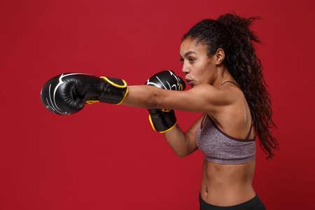 Side view of strong african american sports fitness boxer woman in sportswear working out isolated on red background. Sport exercise healthy lifestyle concept. Make boxing exercises in boxing gloves.