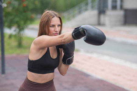 Photo of strong fitness woman boxer in gloves posing outdoors.