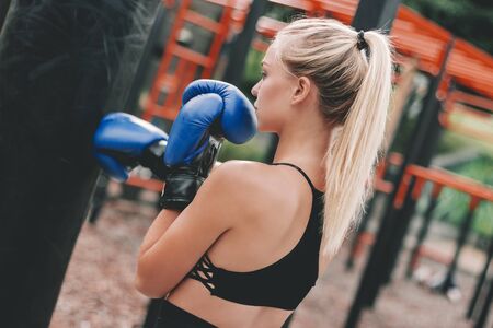 Back view of young female fighter doing boxing exercises on sports ground. Beautiful blonde fitness girl hitting punch bag in boxing gloves. Sports girl training boxing exercises outdoors