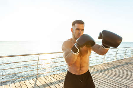 Athletic man in boxing gloves boxing in the early morning on the beach