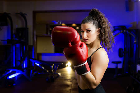 Attractive wavy haired pretty female athlete, woman boxer fighter poses against colored background with red boxing gloves looking confidently at camera through her shoulder. Martial art concept