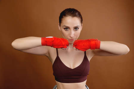 A studio portrait of an attractive Caucasian young woman fighter with bandages on her fists preparing for a fight and looking at the camera. Combat fitness concept. Fitness club advertising