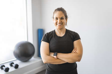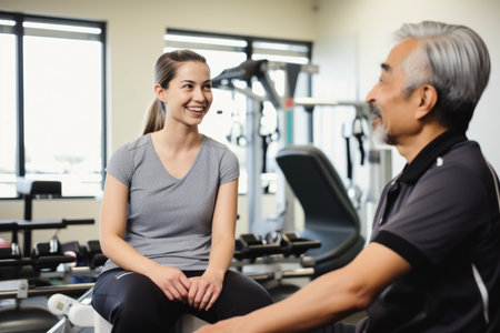 middle aged instructor supporting smiling woman training in rehabilitation center