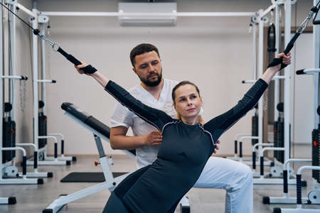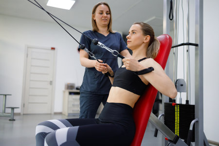 Female doctor rehabilitologist working with female patient on the special rehabilitation device